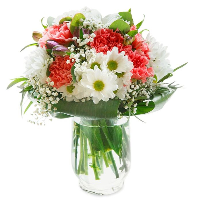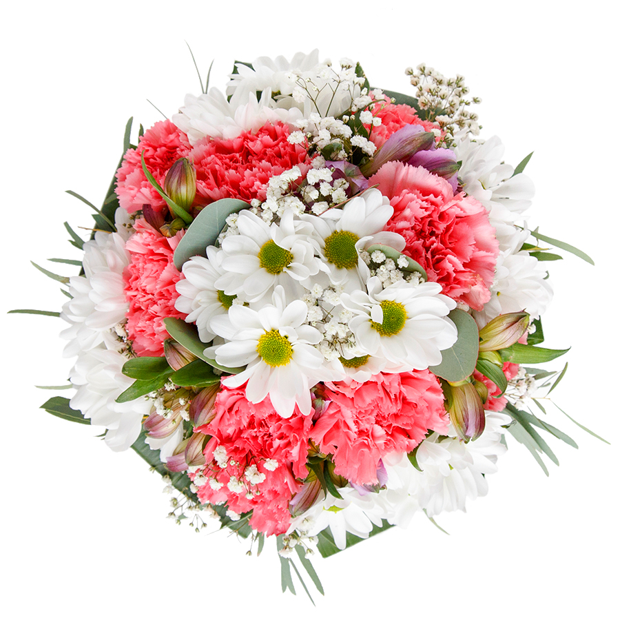 Send a message of elegance with our stunning white and pink floral arrangement. This bouquet combines pristine white chrysanthemums, delicate gypsophila, and soft pink carnations, artistically wrapped with lush aspidistra leaves.